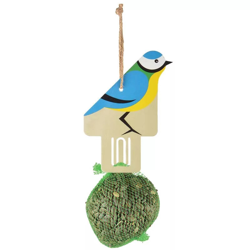 Esschert Design Felakasztható madár mintás madáretető, hálós napraforgómaggal, 20 cm, vegyes minta